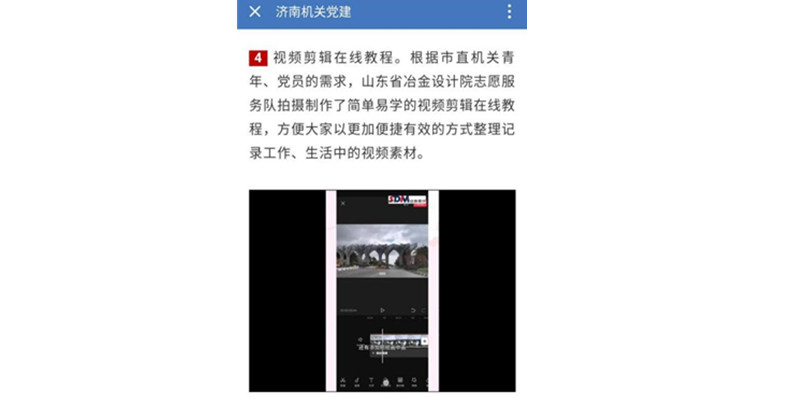 4月1日,為貫徹市直機(jī)關(guān)青年志愿“區(qū)塊鏈”項(xiàng)目部署,公司團(tuán)委積極組建青年志愿服務(wù)隊,結(jié)合市直機(jī)關(guān)廣大黨員、青年掌握簡易視頻剪輯的需要,第三團(tuán)支部、第六團(tuán)支部團(tuán)員青年迅速行動制作了電腦端視頻剪輯教程和手機(jī)端視頻剪輯教程,該志愿服務(wù)項(xiàng)目得到了市直機(jī)關(guān)團(tuán)工委充分認(rèn)可,并在濟(jì)南機(jī)關(guān)黨建平臺予以推廣。