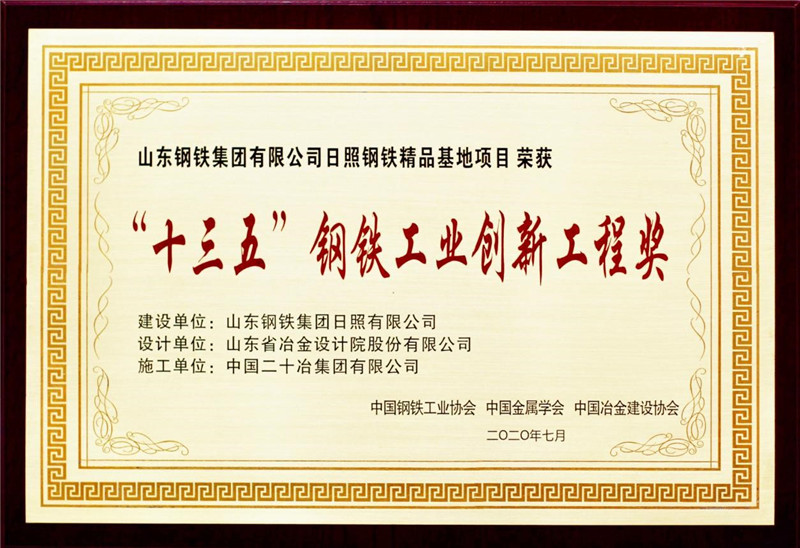 2020年7月31日,中國鋼鐵工業(yè)“十三五”科技創(chuàng)新成果展暨頒獎(jiǎng)典禮在江蘇張家港舉行,由山冶設(shè)計(jì)總體規(guī)劃設(shè)計(jì)的山東鋼鐵集團(tuán)有限公司日照鋼鐵精品基地項(xiàng)目,榮獲“十三五”鋼鐵工業(yè)創(chuàng)新工程獎(jiǎng)。公司董事長魏新民參加了頒獎(jiǎng)大會并上臺領(lǐng)獎(jiǎng)。