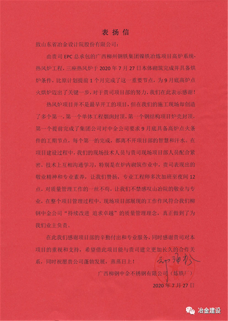 就是憑著這股韌勁和山冶設計“敢打硬仗、一切為用戶著想”的精神,柳鋼中金熱風爐工程的各項工作推進順利,并多次在安全、質(zhì)量、進度大例會上受到表揚。在27日砌筑封頂之后,上午柳鋼中金煉鐵廠送來表揚信,對現(xiàn)場項目部的工作給予了肯定,下午柳鋼中金公司副總經(jīng)理張洪波授予了現(xiàn)場項目部“專業(yè)設計精心施工”的錦旗,盛贊山冶設計專業(yè)、敬業(yè)!