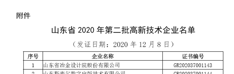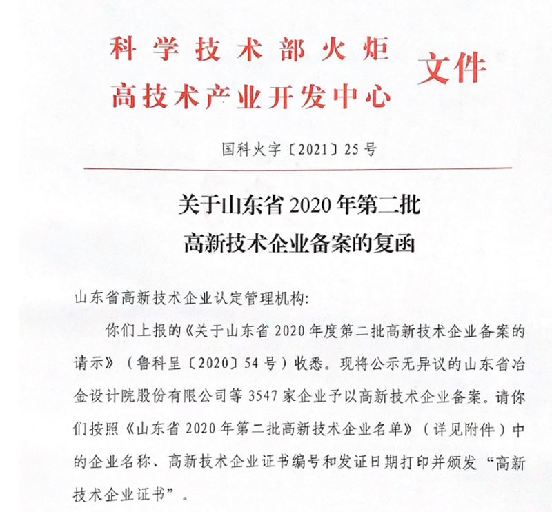 1月15日,根據(jù)全國高新技術(shù)企業(yè)認定管理工作領(lǐng)導小組辦公室印發(fā)的《關(guān)于山東省2020年第二批高新技術(shù)企業(yè)備案的復函》,公司順利通過了2020年度國家高新技術(shù)企業(yè)認定。