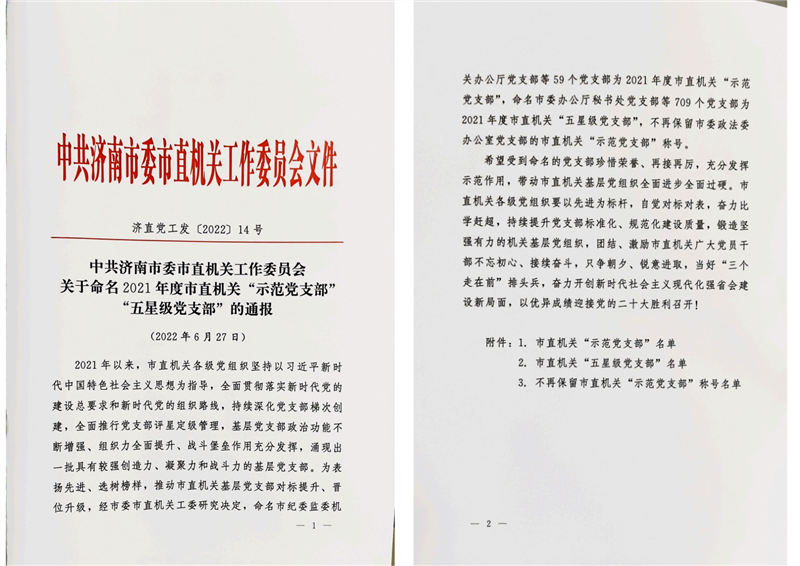 市委市直機(jī)關(guān)工委印發(fā)的《關(guān)于命名2021年度市直機(jī)關(guān)“示范黨支部”、“五星級黨支部”的通報(bào)》(濟(jì)直黨工發(fā)〔2022〕1號文)中,授予我單位熱風(fēng)爐工程技術(shù)分公司黨支部、焦化事業(yè)部黨支部、耀華能源公司黨支部、土建設(shè)計(jì)一部黨支部、土建設(shè)計(jì)二部黨支部、職能管理第一黨支部、公司辦公室黨支部、電氣設(shè)計(jì)部黨支部、經(jīng)營管理黨支部、職能管理第二黨支部共10個(gè)黨支部為“五星級黨支部”。獲獎(jiǎng)支部將繼續(xù)發(fā)揮示范作用,團(tuán)結(jié)激勵(lì)支部黨員,不忘初心、勇于擔(dān)當(dāng),努力為公司發(fā)展做出更大貢獻(xiàn)。