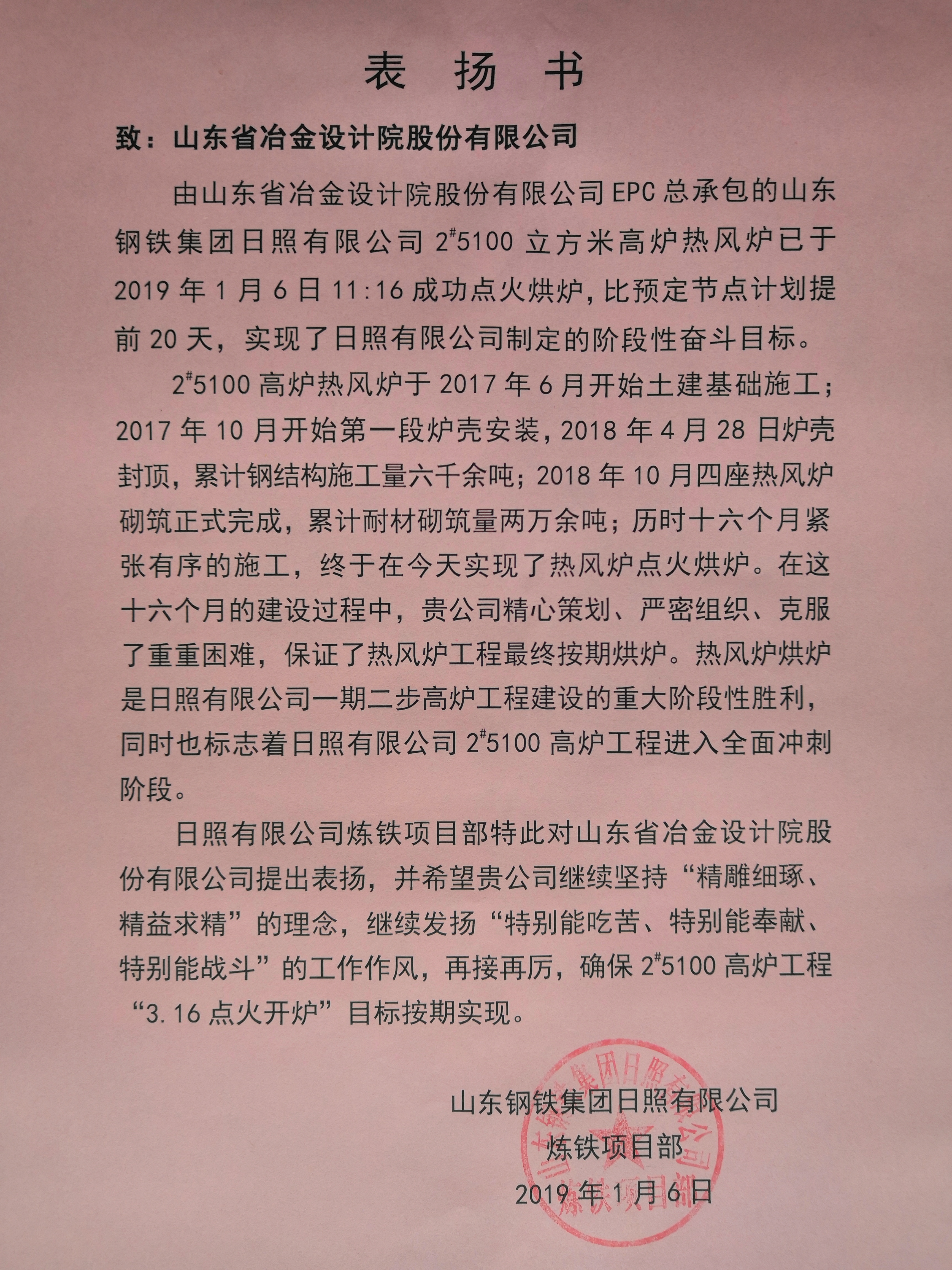 2019年1月6日11時(shí)16分,隨著山鋼集團(tuán)日照公司副總經(jīng)理王子金:“我宣布山東鋼鐵集團(tuán)日照精品基地2#5100立方米高爐熱風(fēng)爐點(diǎn)火烘爐開(kāi)始”的號(hào)令, 由我公司總包的山鋼集團(tuán)日照精品基地2#5100立方米高爐熱風(fēng)爐正式點(diǎn)火烘爐。這標(biāo)志由公司總承包2#5100立方米高爐工程熱風(fēng)爐烘爐的重大節(jié)點(diǎn)比計(jì)劃提前20天實(shí)現(xiàn)階段性?shī)^斗目標(biāo)。公司副總經(jīng)理劉洪亮參加烘爐儀式并發(fā)表了講話。當(dāng)天,山東鋼鐵集團(tuán)日照有限公司向公司發(fā)來(lái)了表?yè)P(yáng)書(shū),贊揚(yáng)山冶人堅(jiān)持“精雕細(xì)琢、精益求精”的理念,希望再接再厲確保后續(xù)工作目標(biāo)如期實(shí)現(xiàn)。